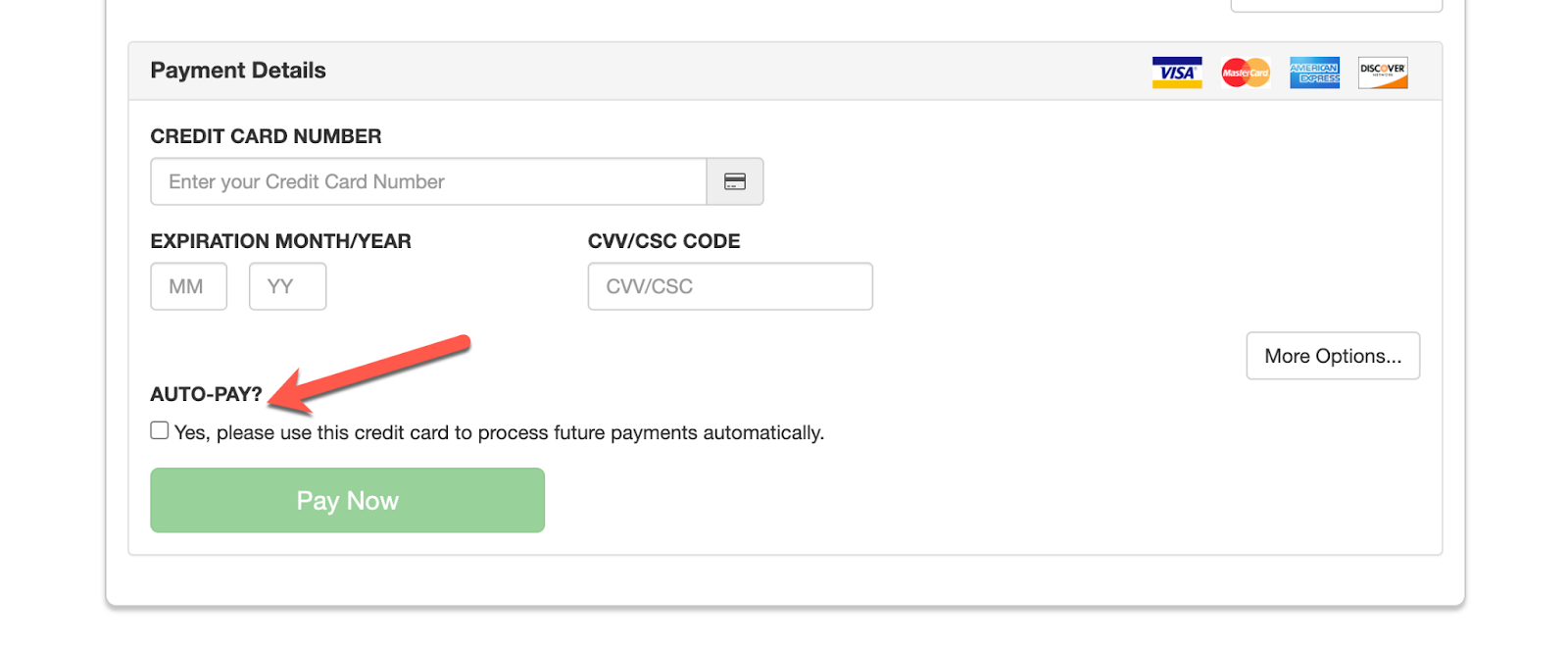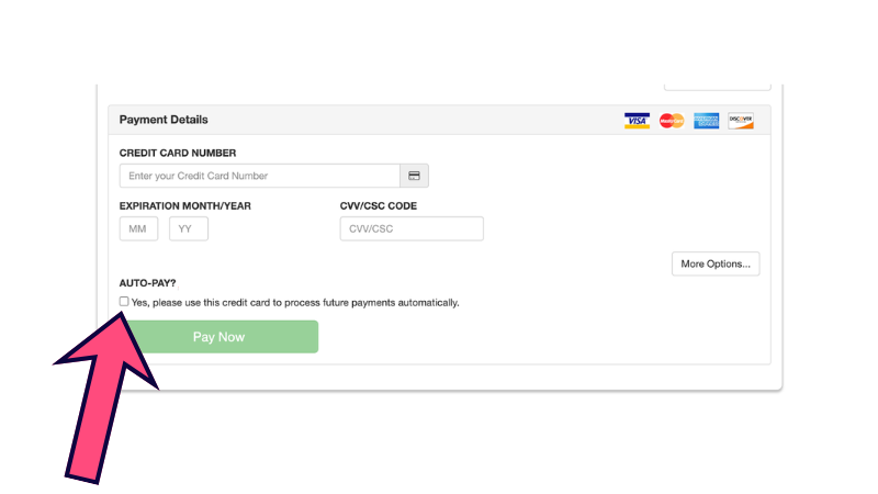 If you chose “Pay via credit card,” check the box “Yes, please use this credit card to process future payments automatically.”