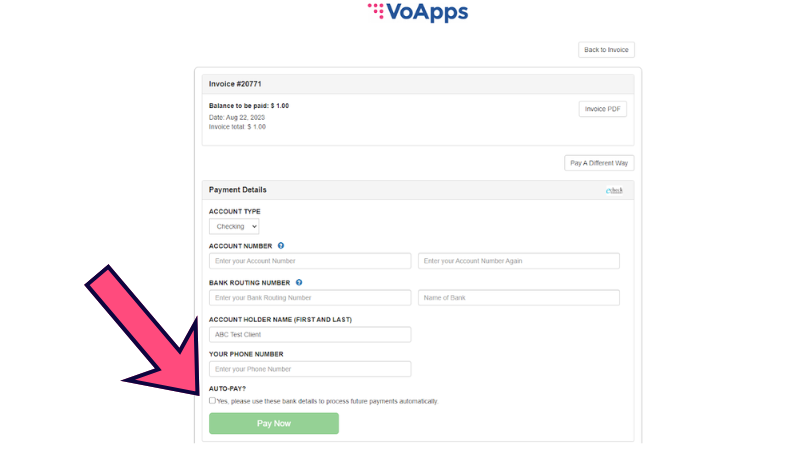 If you chose “Pay via ACH / eCheck,” check the box “Yes, please use these bank details to process future payments automatically.